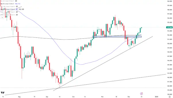 除了利率决定本身,当天14:30的央行行长新闻发布会或许更值得关注。若传递出鹰派信号(明年1或3月加息的暗示),或能帮助日元获得短暂的喘息空间。